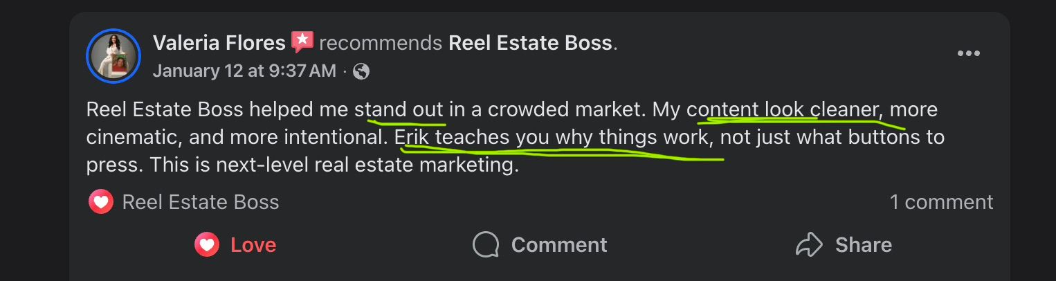 â I feel like i'm falling behind I see other agents consistently posting viral reels for their listings and personal brand â and it makes me feel like i'm playing catch-up. I know I could do this⌠I just havenât been shown how.